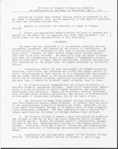 Petition of Rutgers College Sub Committee on Coeducation to the Board of Governors, May 1, 1971. University Special Collections and University Archives.